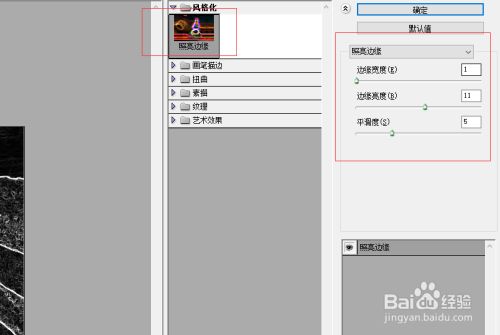 接着我们从滤镜库中找到风格化里面的照亮边缘,选择并设置如图所示的参数;接着我们使用色阶来调整当前图层,参数的设置如图所示。
