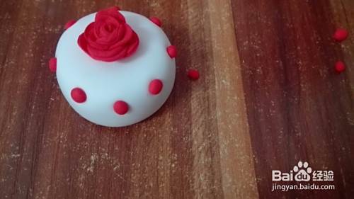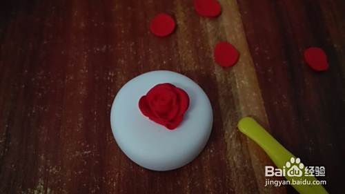 取一些红色,平均分捏成小圆球,并压平。拼凑在一起变成一朵玫瑰花,固定在蛋糕的中央。