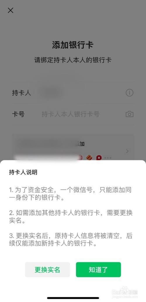 点击持卡人右侧图标,根据下方提示,添加其他人银行卡,需要更换实名。点击下方更换实名就可以了。
