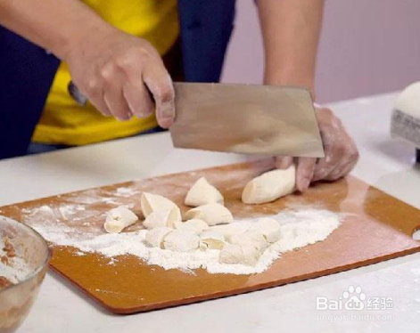 案板上撒一些干面粉防止粘连,将面团放在上面揉搓光滑,搓成长条,再切成大小相等的面剂子,把每个面剂子都擀制成饺子皮。