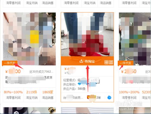 我们可以看每个宝贝的左下角都会显示“一件代发”图标,鼠标经过会显示“传淘宝”符号,说明这款产品支持一件代发至淘宝。