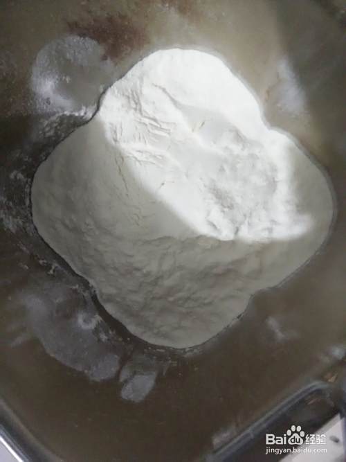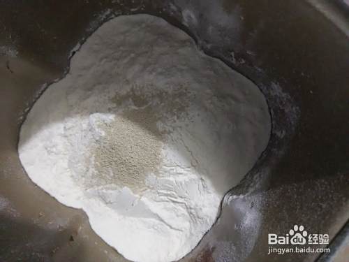 在面包桶里加入面粉,再加入酵母,要根据自己的面包机容量调节面粉的多少。