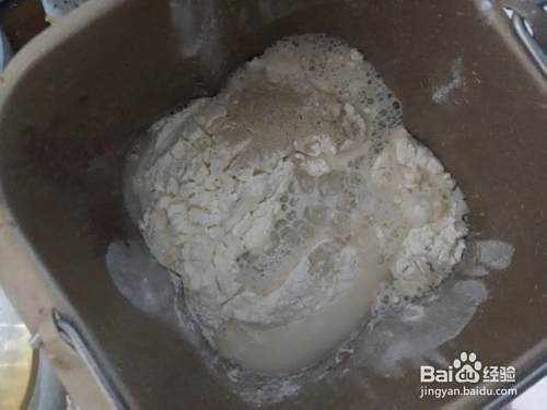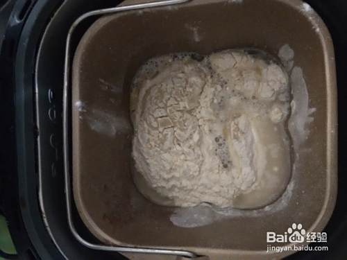 再加入适量的温水(可根据自己面粉的吸水性增减水的用量),把面包桶放入面包机内,通电启动和面程序20分钟。