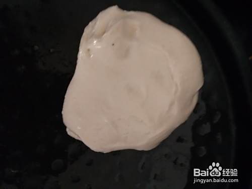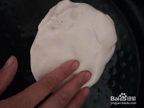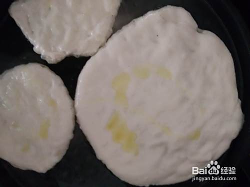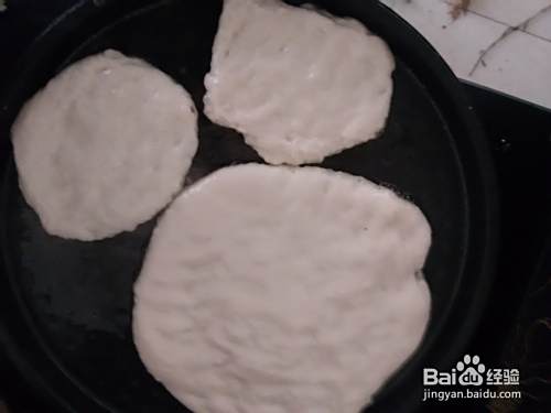 洗净双手用手粘上清水,揪出适当大小的面团放在电饼铛上,用手向两边慢慢摊开(如图)。