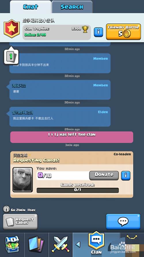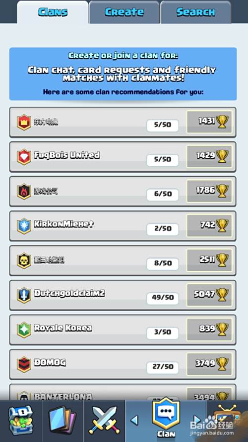 可以查看部落,创建部落,搜索部落。玩家经验等级3级以上解锁。部落里可以要卡,捐卡。普通卡一次可以要10张,捐2张,稀有卡一次可以要1张,捐1张,史诗卡不能捐收。捐普通卡有1经验,5金币,捐稀有卡有5经验,50金币,多捐卡可以快速积累金币和经验。部落内部可以看到每个玩家的卡牌配置、经验等级、还可以约战,约战会扣除玩家5金币,无任何收益。尽量多要兵,尽量多捐兵,能够快速提高自己的战斗力和经验等级。
