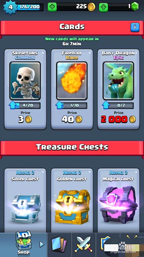 4.箱子:联机模式下获得银箱子、金箱子、魔箱子。另外还有免费的木头箱子,4小时开一次,最多累计2个。开箱子获得钱和卡片,其中开木头箱子和皇冠箱子有宝石。