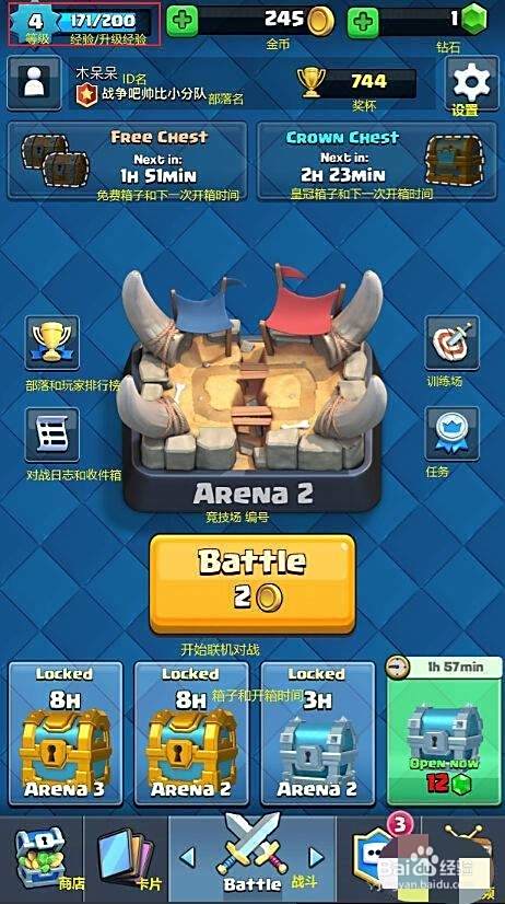 6.等级和经验:积累经验可以提高等级,皇冠塔的等级随着玩家等级提高,级别越高,玩家的防御越高。完成任务、升级卡片、捐卡都可以获得经验。3级以上可以加入部落、创建部落。
