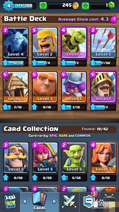 卡片用于联机对战,能不能打赢就看这些卡片了。battle deck指参战卡片,仅限8张。旁边的average elixir cost指平均圣水费用。平均费用低,对战策略灵活,容易调整,但是不够强力;平均费用高,部队强力,但是不够灵活。玩家可以根据自己的打法和需求来配置卡片。在对战中每次从4张不同的卡片中选一张。