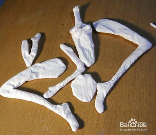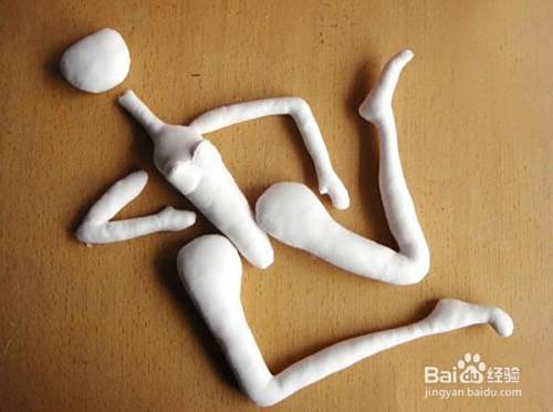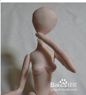 把棉花从返口塞进去,塞满以后把返口缝好。各部分做好后摆一下娃娃四肢的位置。
