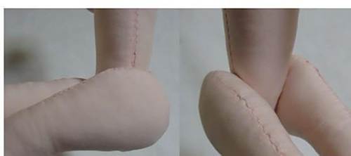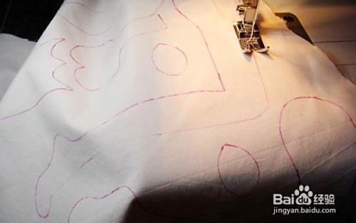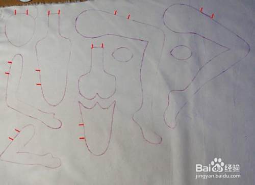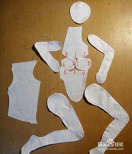 把头,胳膊和腿用缝纫机车好,请注意看我图上有胳膊和腿的地方用竖线标记了一段小距离,那里不要车合,是留返口把布翻过来的地方。如果没有缝纫机,用手缝也可以,最好用回针缝。