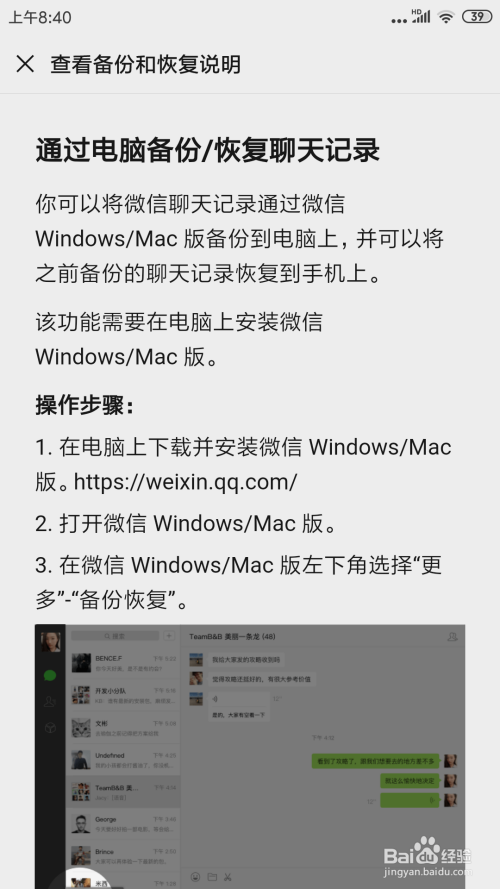 最后是在打开的页面里找到“聊天”点击打开.在打开的页面里找到“聊天记录备份与迁移”点击打开.在打开的页面里找到“备份聊天记录到电脑”点击打开.即可查看备份和恢复说明了。