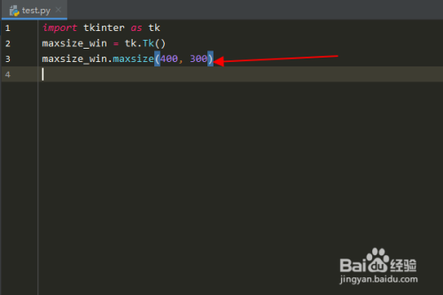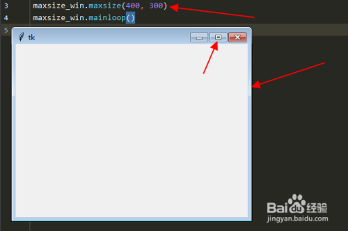 再输入:“maxsize_win.maxsize(400, 300)”,设置窗口最大尺寸(即:窗口拖拽或最大化时,可以显示的最大的宽度和高度)。