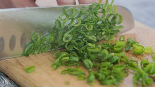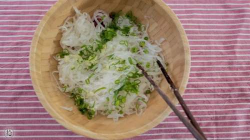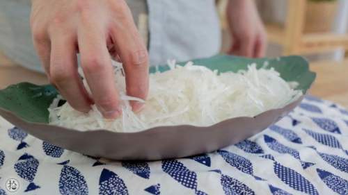 11把白萝卜丝和肉糜混合,拌入姜末和葱花。