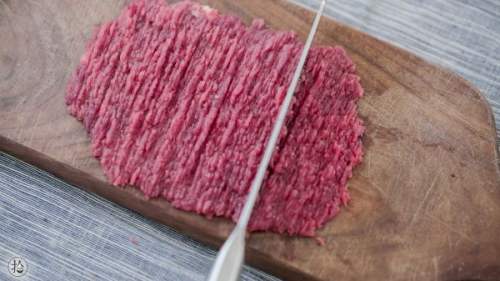 7牛肉洗净,逆纹理切片后,细细剁成肉泥。