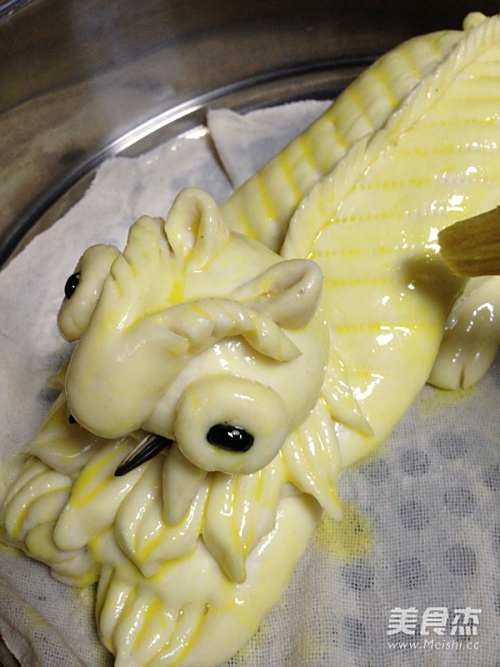 24做好的小老虎生坯加盖醒发20分钟,表面刷一层蛋黄液。 放入蒸锅内蒸20分钟。
