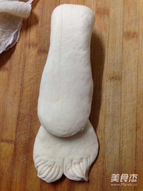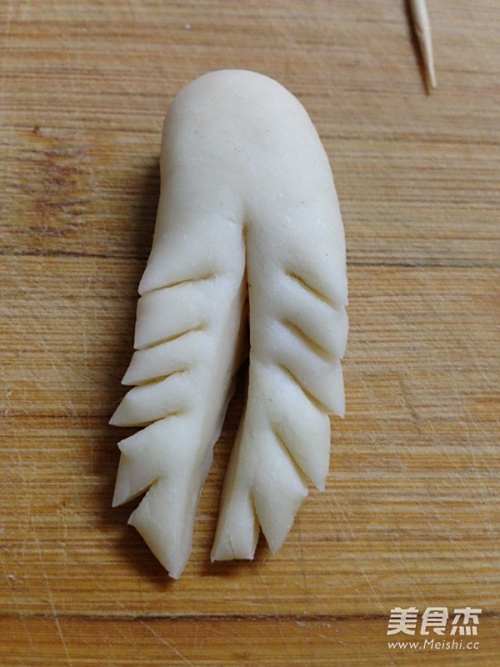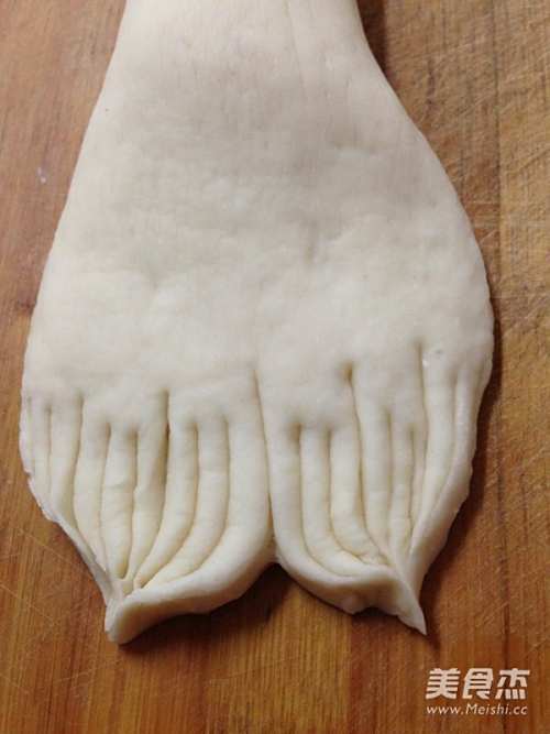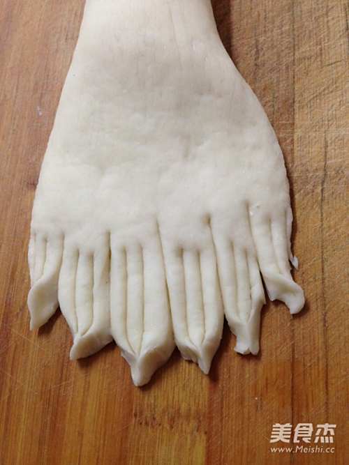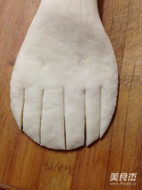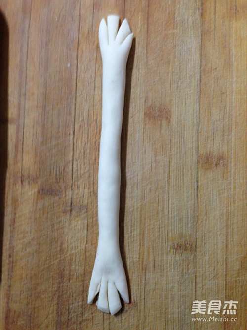 12称出55克面团一个,滚圆后搓成条,两端稍按,分别切3刀切出后脚趾。