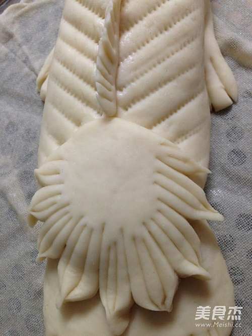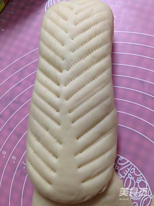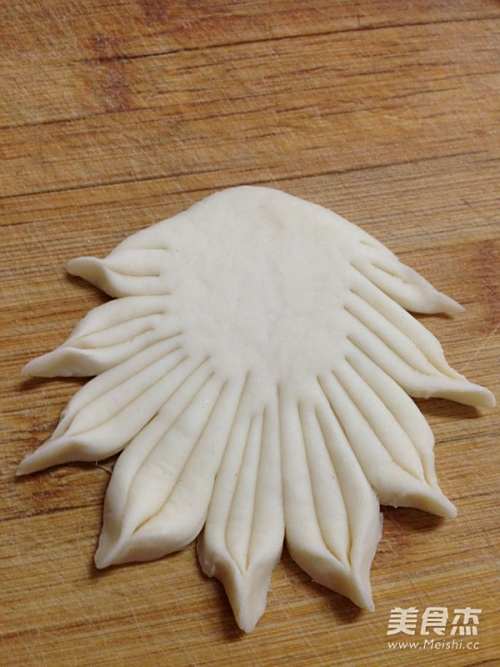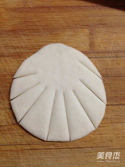 9另取一块35克的面团搓圆后按扁擀成片,在一侧切8刀