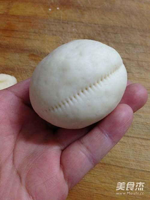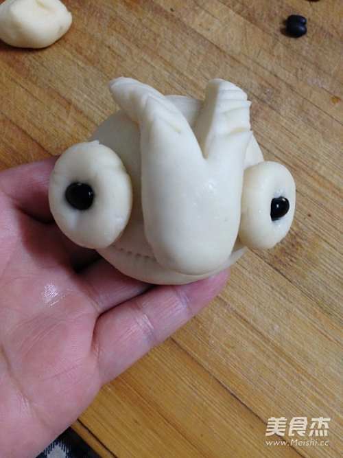 16取一块85克重的面团搓圆,用小梳子在中部向内压出嘴形。