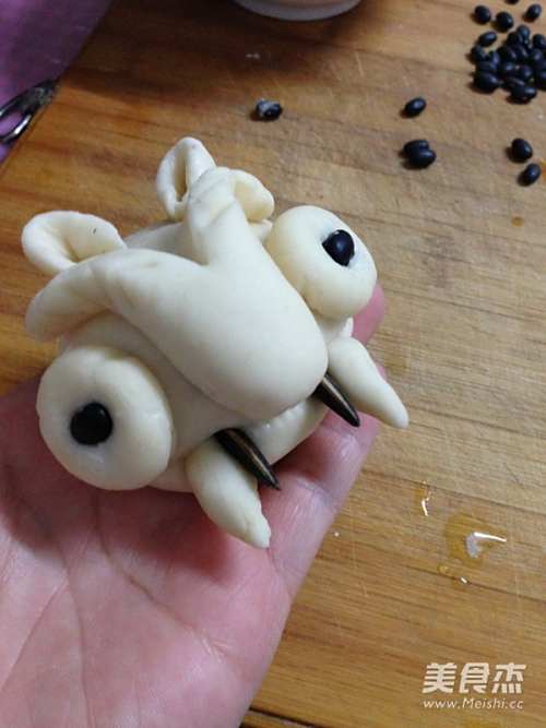 19部件底部刷水后安装到小老虎鼻子的部位,用竹签扎出鼻孔。圆片安装到眼睛部位,在按上抹了水的黑豆做眼睛。