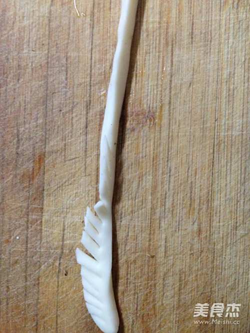 14另取一块10克的小面团,搓成长条,捏成三角条形,顶部用剪刀剪碎边