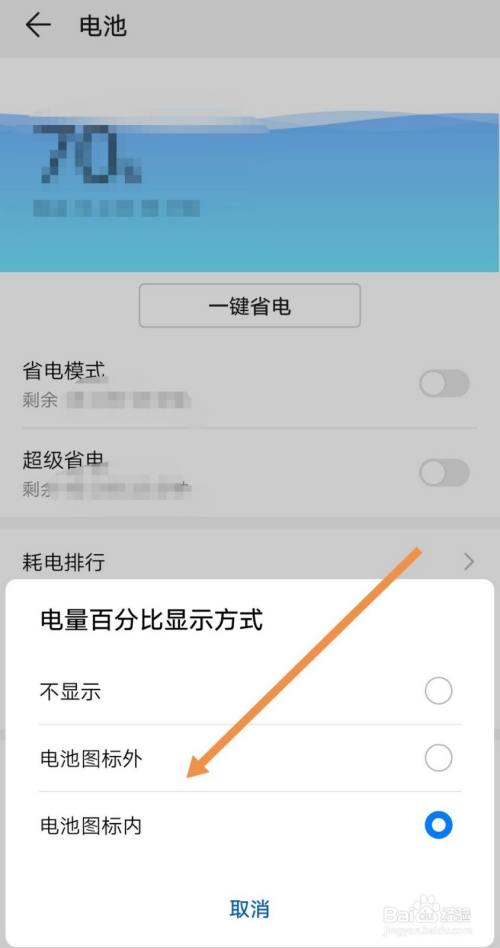 “矩形方框”代表电量,里面的数字代表所剩电量数值。可通过华为手机管家进行设置。