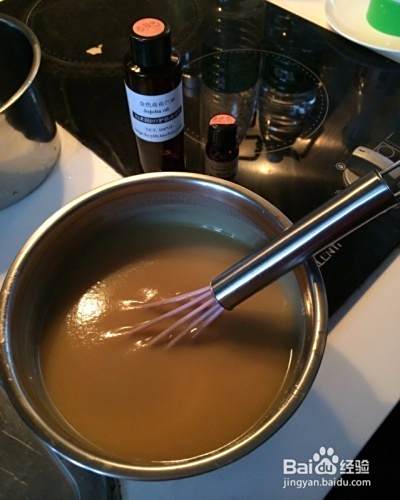 完成好上面的步骤后开始溶碱,碱液制作完成后,将油脂倒入碱液,开始搅拌。大约需要搅拌半小时左右即可,然后添加添加了金色荷荷巴油和迷迭香精油