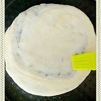 用刷子往饼铛上刷少许油,饼上面也同样刷少许油,盖好盖就可以烙了。