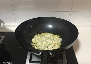 利用蒸鱼时间开始炒料。锅中倒入适量油,关小火爆香葱姜蒜。