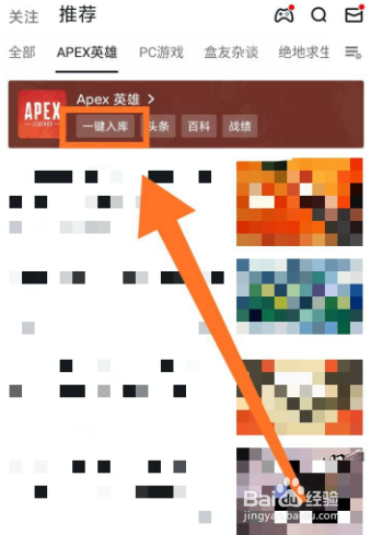 打开手机中下载好的小黑盒APP,然后搜索并找到apex英雄点击一键入库。