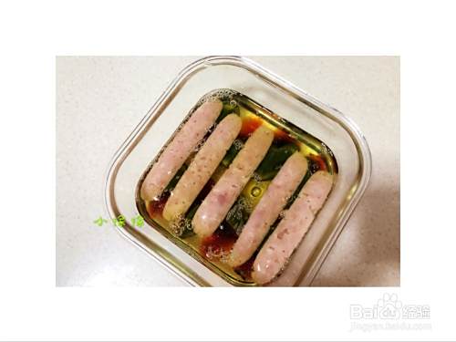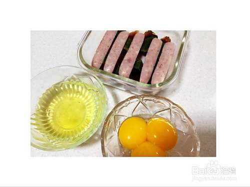 两个鸡蛋。把蛋清和蛋黄分开。刷容器里的油。准备鸡蛋和香肠。
