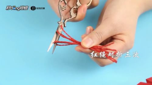 12将红绳对折三次,将一头剪开。