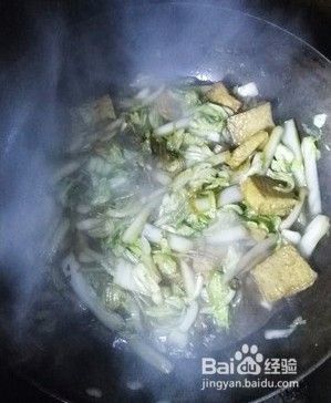 然后放入粉条、豆腐(不用放水,白菜本身会出水),翻炒均匀,依次放入酱油、十三香调味(如果白菜出水慢,可以稍加一点点水,免得粉条糊锅)。