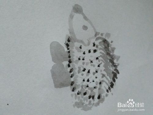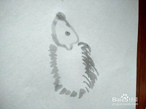 然后在一侧划出一个半圆作为刺猬的耳朵。我们画出它尖尖的头部轮廓。最顶端画出一个黑色的圆。这是小刺猬的鼻子。同样也是一个黑色的点,比较小的。这个是刺猬的眼睛。