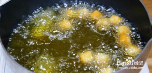 2,豆腐块的外面要裹水淀粉,水淀粉遇热会发生粘性,包裹住豆腐,使豆腐在炸制成熟的过程中,保留水分和鲜嫩,营养少流失。