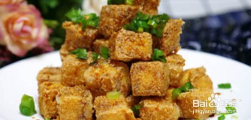 3,炸制豆腐必须是热油,豆腐块一入锅就马上定型了,如果油温不够,就会变成油煮豆腐,使豆腐内部的水分散发,出现孔状,豆腐就不水嫩了。