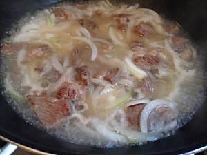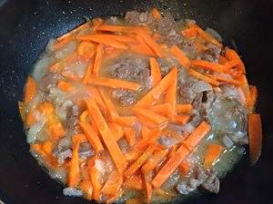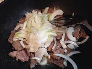 直到肉开始出汁,加入洋葱,继续煸炒,至水分稍微减少,加开水,至七八分满,大火煮开后,中小火炖煮30min左右。