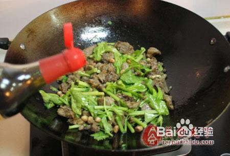 3、放入芹菜,炒香,调入生抽、糖调味,翻炒片刻起锅即可。