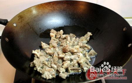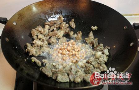 2、锅里放入花生油,7成热后放入剔骨肉,,炒香后放入嫩花生。