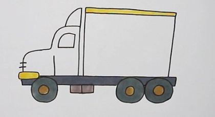 接着把大卡车的车头画出来,注意画出车门和车窗,再把大卡车后面的大车厢画出来就可以了。