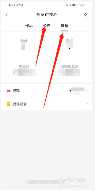 可以查看公告、数据(阅读、播放、粉丝)