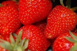 草莓(学名:Fragaria × ananassa Duch.),多年生草本,高10-40厘米。茎低于叶或近相等,密被开展黄色柔毛。叶三出,小叶具短柄,质地较厚,倒卵形或菱形,上面深绿色,几无毛,下面淡白绿色,疏生毛,沿脉较密;叶柄密被开展黄色柔毛。聚伞花序,花序下面具一短柄的小叶;花两性;萼片卵形,比副萼片稍长;花瓣白色,近圆形或倒卵椭圆形。聚合果大,宿存萼片直立,紧贴于果实;瘦果尖卵形,光滑。花期4-5月,果期6-7月。草莓原产南美,中国各地及欧州等地广为栽培。