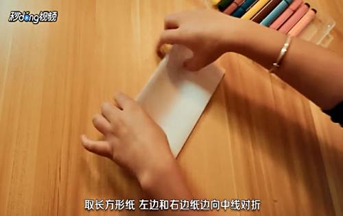 1取长方形纸,左边和右边纸边向中线对折,接着把折纸沿着折痕分成三个纸边。