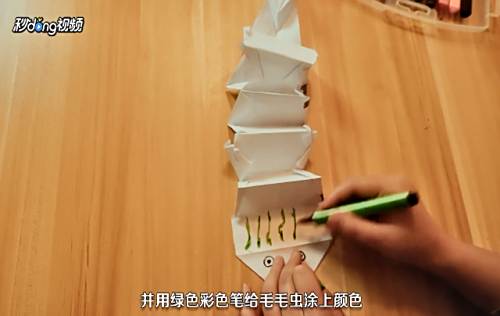 4并用绿色彩色笔给毛毛虫涂上颜色,在裁出的白纸边上用绿色彩笔画出一片树叶,放在折纸毛毛虫的下边即可。END