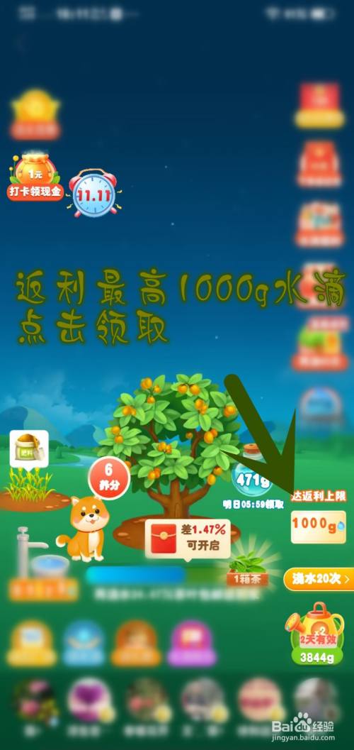多多果园页面浇水会随机出现全额返水滴任务,按要求浇水能获得返利卡,再次浇水最高可以获得1000g水滴。