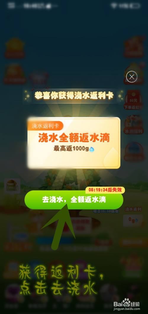 获得返利卡,点击去浇水。