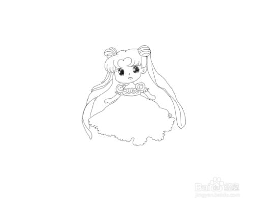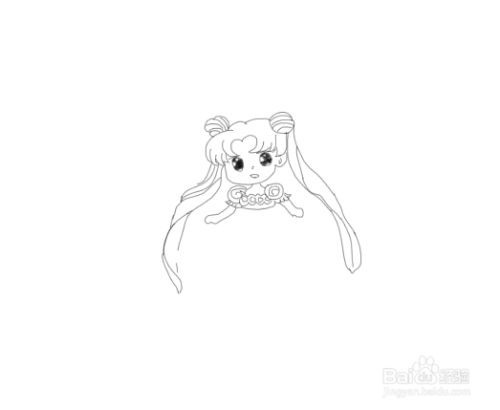 再在两个丸子发束的基础上再画出女孩的两条长长的大辫子,如图所示:
