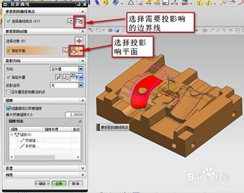 如上图所示,如果按常规做法,我们都是加箱体求差然后修剪掉多余部分,但这样做比较费时间以及效果不理想。遇到这种情况应该用逆推思维做法,用投影响曲线先找出最大外形,如下图: