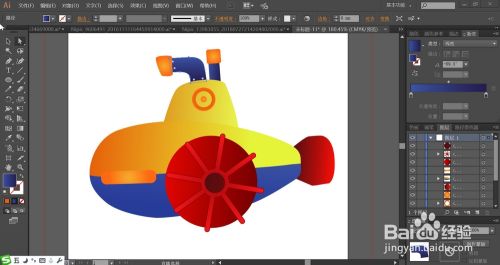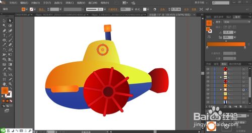 使用黄色的渐变填充潜水艇的上方结构件,正面的圆圈用桔黄色的渐变填充。