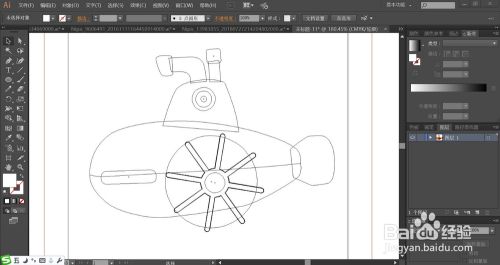 选择钢笔工具,我们画出潜水艇的基本轮廓,重点是正面的舱门,上方的观望镜,后方的尾部结构件的路径。