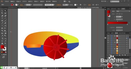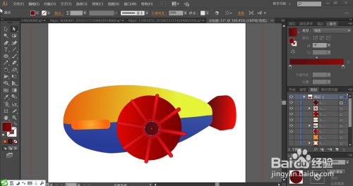 接着,我们用暗红色的渐变填充潜水艇的尾部,再用深红色的渐变填充舱门中心的圆形结构件。
